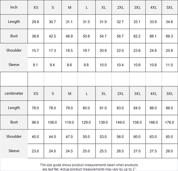 This size guide shows product measurements taken when products are laid flat. Actual product measurements may vary by up to 1".