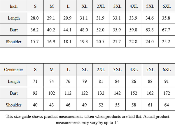 This size guide shows product measurements taken when products are laid flat. Actual product measurements may vary by up to 1".