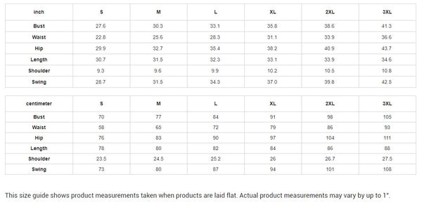 This size guide shows product measurements taken when products are laid flat. Actual product measurements may vary by up to 1".